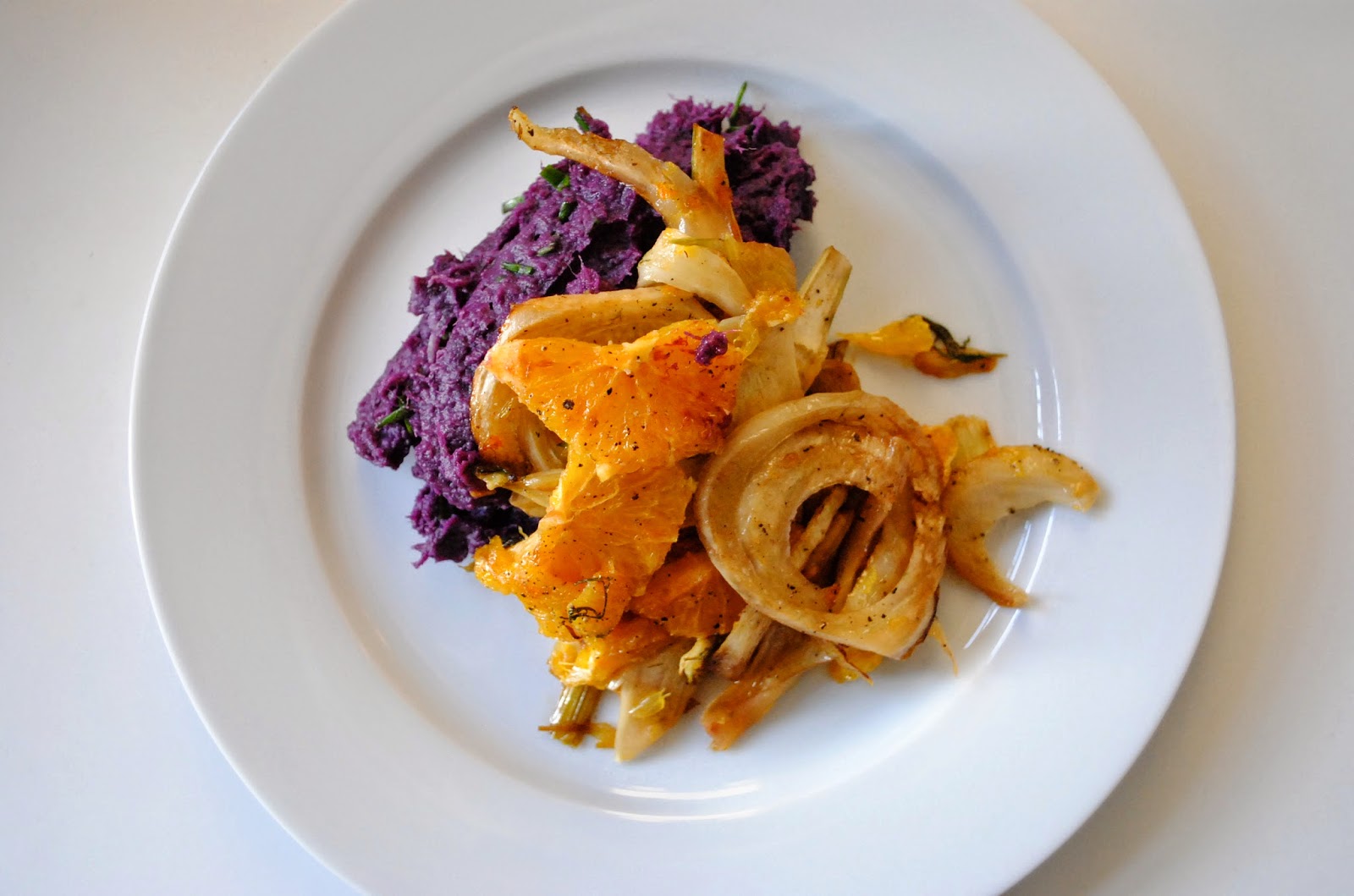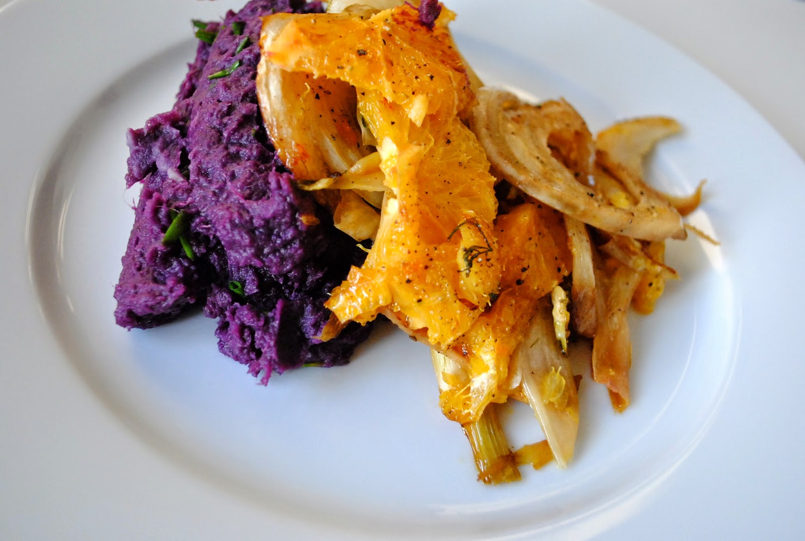 SÜß GEBRATENER FENCHEL MIT FILETIERTEN ORANGEN AN SÜßKARTOFFEL-SCHNITTLAUCH-STAMPF